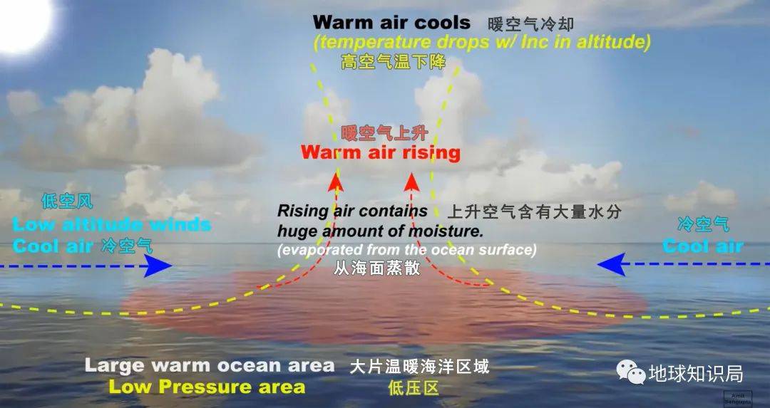 在一片足够大且表面温度保持在27℃以上的广阔海洋上,水汽不断地蒸发而来,因为具有较高的温度而上升,并在高层凝结放热,循环往复,形成了较周围更暖的结构,成为台风胚胎。随着积云逐渐强盛,云带不断扩大,台风胚胎在壮大中继续发展成热带低压,乃至台风。