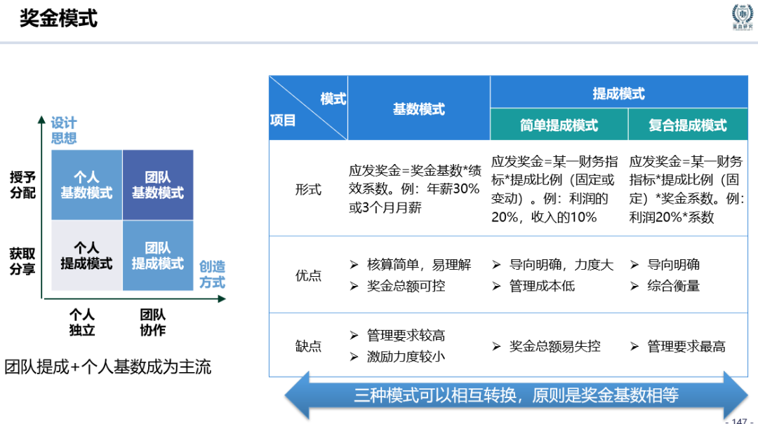 提成模式打破了奖金上限,理论上有无限可能,因而具有更强的激励效应。提成模式的设计难度开始加大,必须考虑挂钩对象、挂钩比例、分段等多种因素,并进行测算,而且可能需要经常性的调整,HR们再也不能像原始基数模式那样悠悠哉哉了。