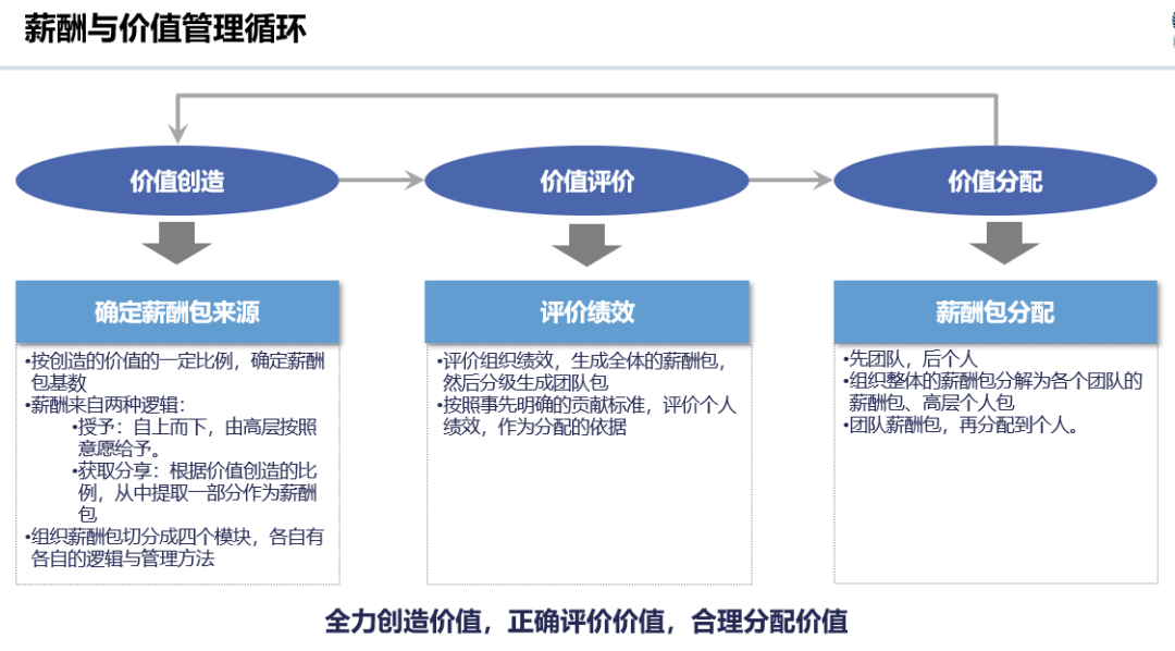 与价值创造对应的是整体薪酬包,薪酬包中的工资作为生产要素(成本),投入价值创造中,价值创造出来后,再从中分一部分成为薪酬包的奖金包,薪酬包包含工资(福利)包、奖金包。薪酬包才能与价值创造完整挂钩,如果用奖金包来直接挂钩,不仅拐了一道弯,逻辑行不通,还增加了复杂性。