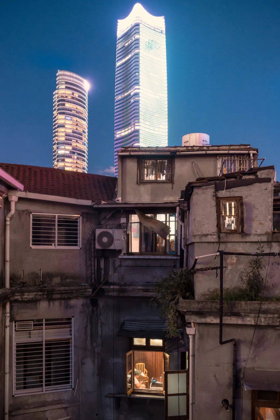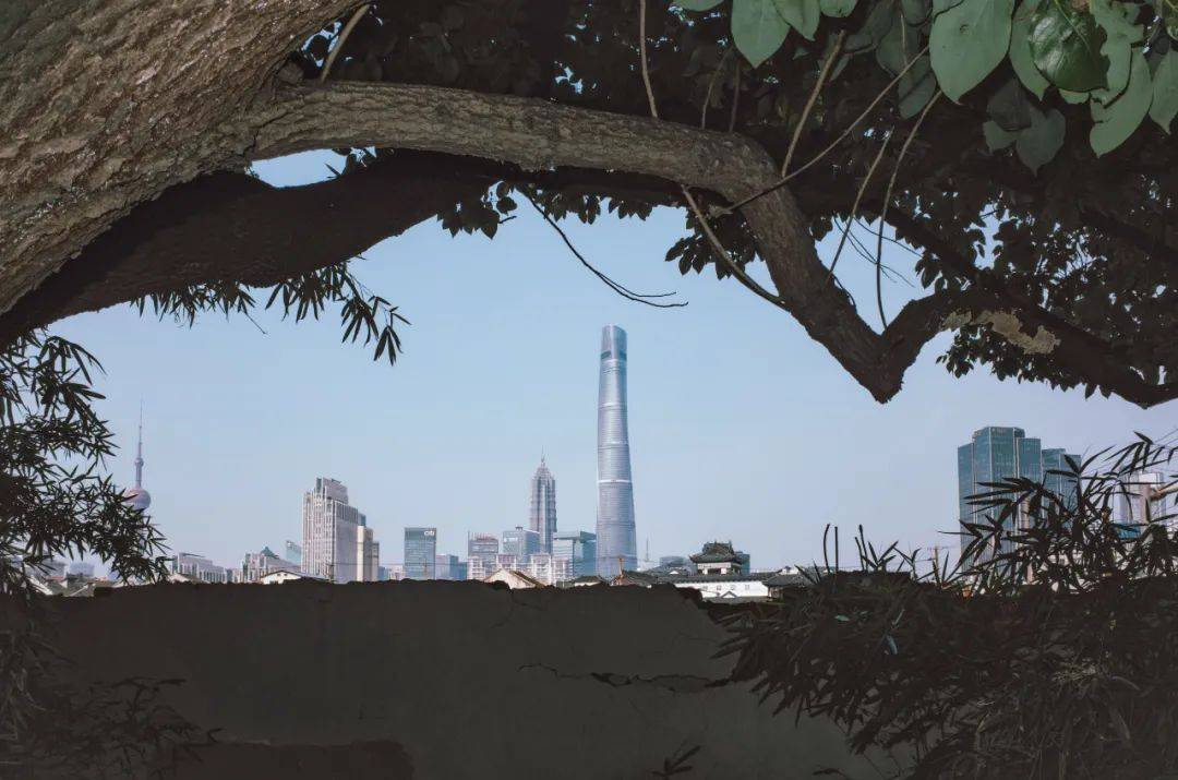 从一个破洞看向远处的酒店大楼,房子由高到低,仿佛是一块切片,凝固着新旧更迭的魔都岁月。