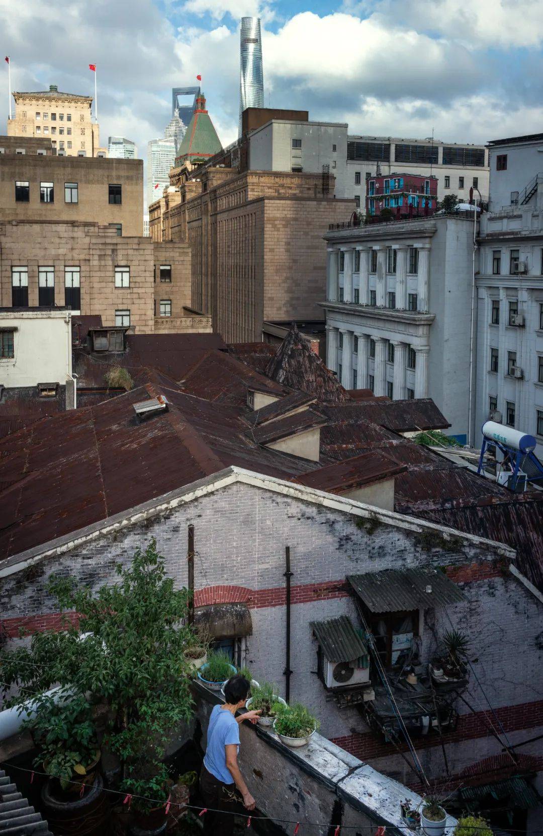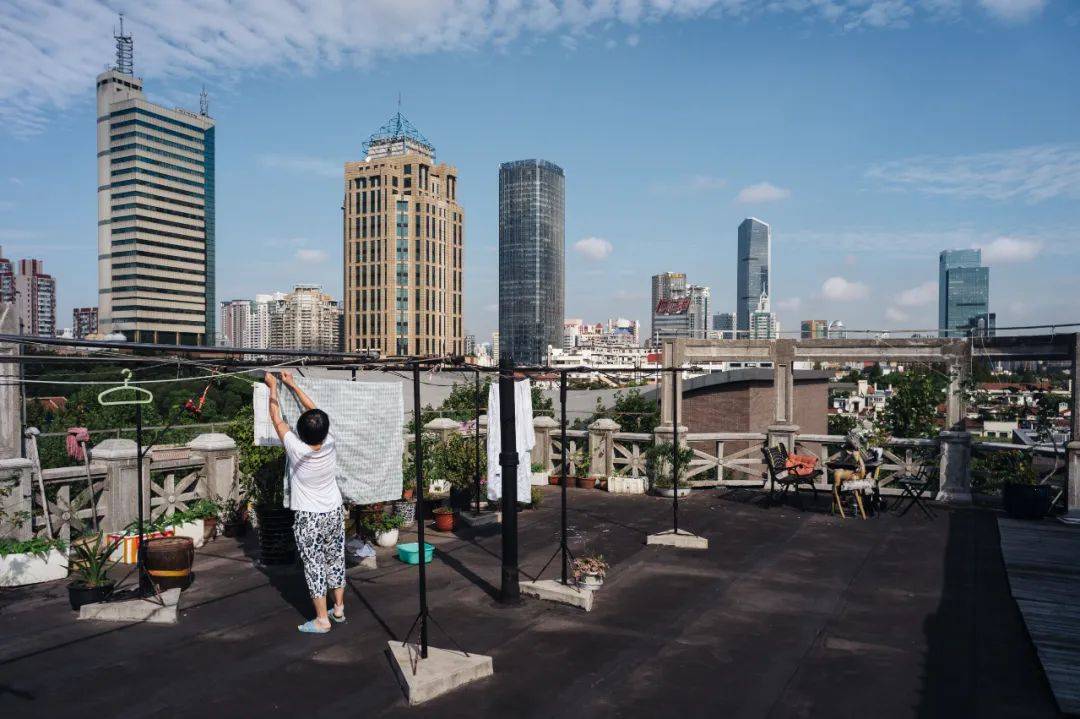 他最喜欢的一张照片,对许多人来说可能有些平淡无奇,是一位阿婆在天台浇花的场景。繁华的外滩背景前,她穿着蓝色短袖,摆弄着自己养的花花草草。