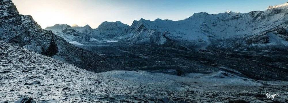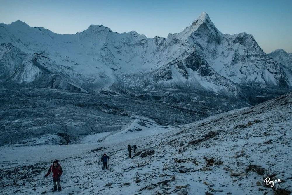 到了观景台后,就可以看见两条巨大的冰川在脚下汇合,生平第一次看见这么壮观的冰川场景,一下子有点被震住了。过了一会儿,阳光开始一点点染上Ama Dablam峰,整个峡谷被唤醒了。