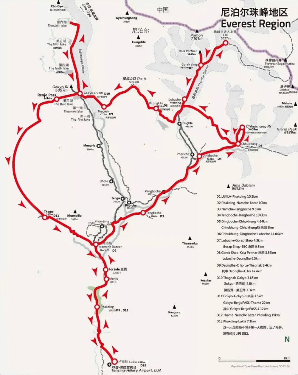 EBC超级大环线(三垭口&四条沟)是这些路线中最艰难的,除了骨灰级发烧友,鲜少有人选择。它包括三个垭口、三个观景台和四条沟。三个5000m垭口分别是:Kongma La(5535m)、ChoLa(5420m)、Renjo La(5345m)。3个5000m观景平台分别是:Chhukung Ri(5546m)、Kala Patthar(5545m)、Gokyo Ri(5360m)。