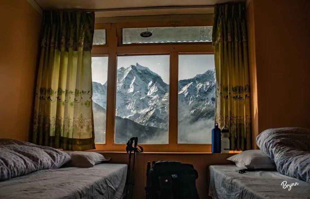 Pangboche是我特别喜欢的一个村子,在一个很大的山坡处,非常闲适。入住的客栈环境非常好,因为实在太喜欢,还给客栈拍了很多照。客栈的饭菜好吃,房屋设施齐全,卫生间、感应灯,各方面都很不错。房间也很干净、整洁,透过窗户,就可以看见外面的山。除了晚上有点冷,其它条件简直就是完美。