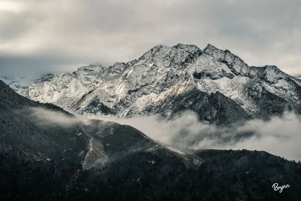 一下子奔到昨天拍过村子全景的地方,一阵狂拍,雾气一阵一阵的。云雾下的雪山更美,有一种强烈的神秘感。我一个人在山坡上,按捺不住心里的喜悦,这里跑、那里跑,不停地按快门,觉得哪里都很美。