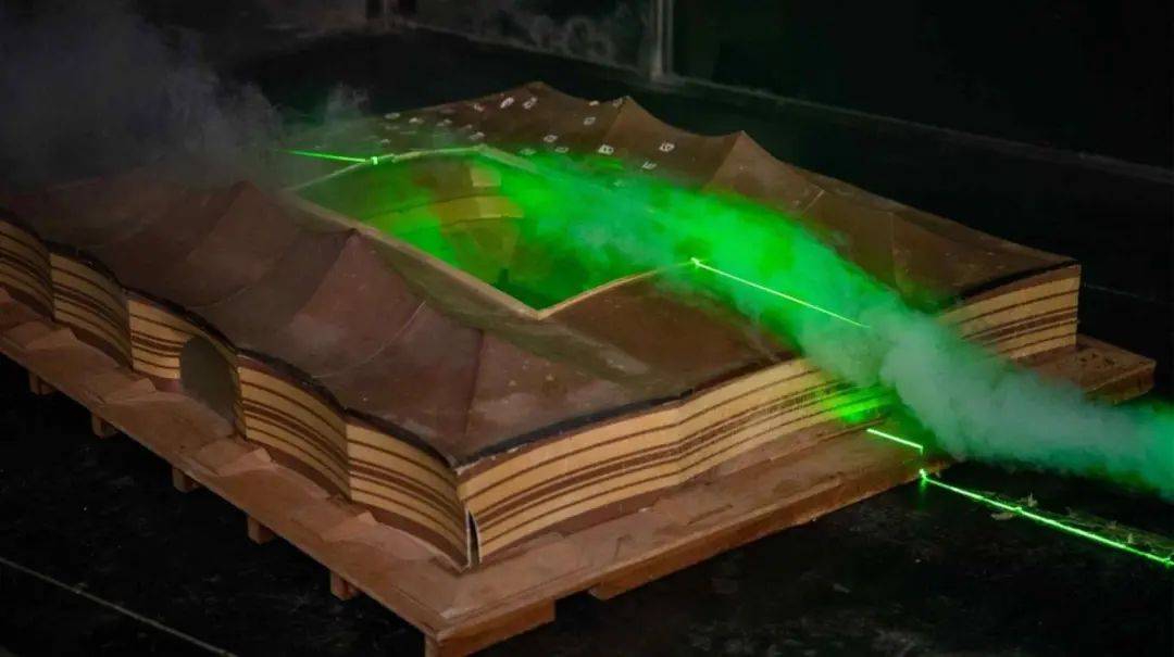 他们还利用烟雾与激光,对 3D 打印的场馆模型进行了风洞模拟,观测在不同的风速、气压下空气的流动。让屋顶的弧度尽可能分散热气,不进入场馆内部。