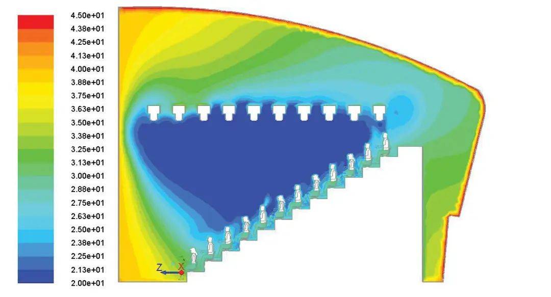 这套“大小喷嘴”结合的系统特别之处在于:它的目的并不是让整个场子都冷下来,而是更精确地“定向降温”,只作用在人出现的区域。这还不到整个空间面积的十分之一。工程师们研究出了一套精准的流体动力学模型:通过测算空气流动的速度与角度,来设置每个出风口的角度。