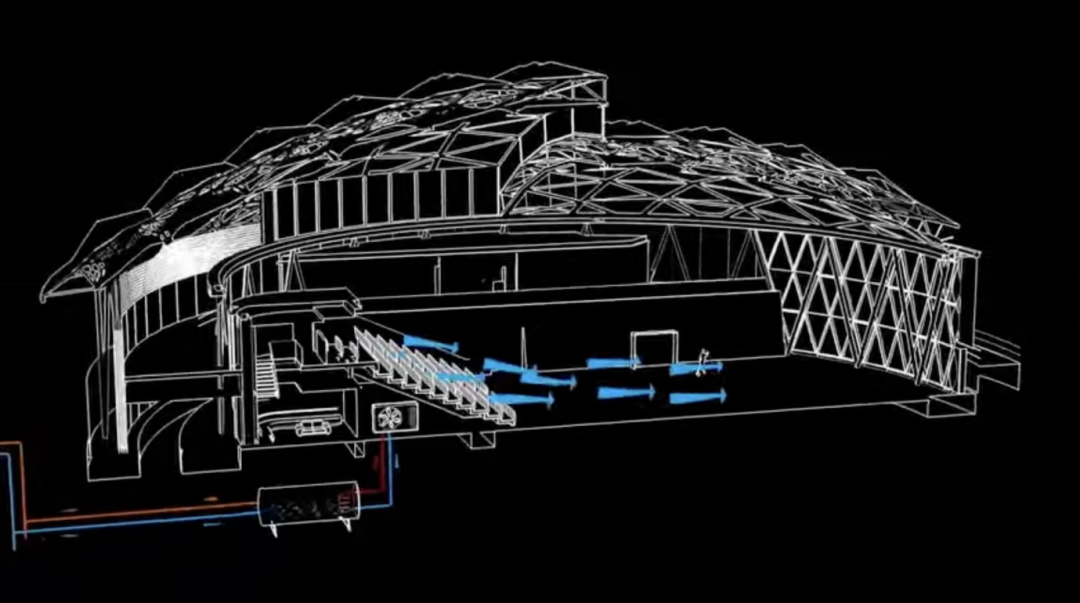 首先,观众席的座位下面,“藏”着数百个通风口,就像是淋浴喷头的小喷嘴一样。它们会从观众脚踝的高度,吹出强度小却密集的冷气流,让空气温和地流通起来,而不是“呼呼”地吹得人头痛。