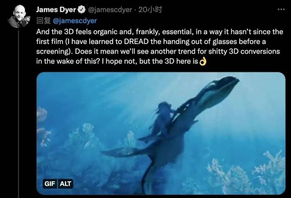 今年9月的时候,有一部分美国媒体已经看过了20分钟左右的片段。大家给予了一致好评,不仅3D视觉效果和动作编排被夸上了天,卡梅隆对情感的细腻处理同样是全球大导的王者。