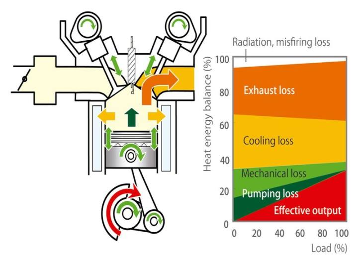 按照较常用而粗线条的分划,主要是排气损失(exhaust loss)、冷却损失(cooling loss)、摩擦/机械损失(friction/machanical loss)和泵气损失(pumping loss),余下的占比便是所谓热效率。