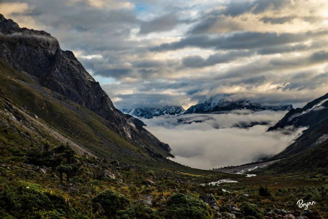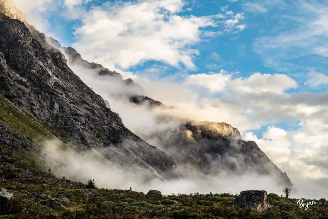 随着徒步次数的增多,徒步时的心态也发生了改变,从一开始的“小心翼翼必须按照路书来走”,变成了“在保证安全的情况下,看见喜欢的地方,可以多花时间欣赏”。于是,徒步第一天,我和同伴Sam在风景很好的两岔河附近露营,而没有选择继续赶路到日乌且营地。也就是这个原因,次日早上,我看见了最爱的山景之一,晨曦下的云雾,随着阳光,随着风,在山石间流动。