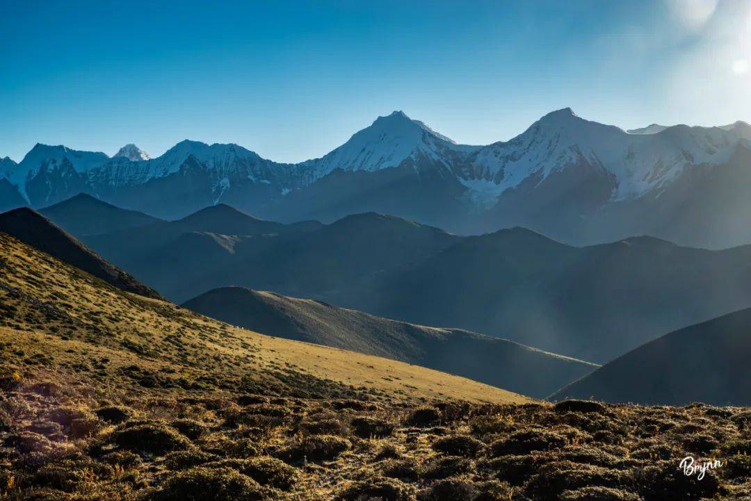 贡嘎西坡的日出,不如东坡美。但也有另一番味道,可以看见阳光一点点从山头穿过来,慢慢映照在山谷里。