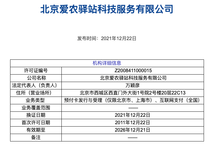 记者通过中国人民银行网站了解到,爱农驿站在2011年12月首次获得《支付业务许可证》,在2021年换证,目前所持许可证的有效期到2026年12月。