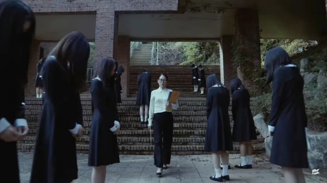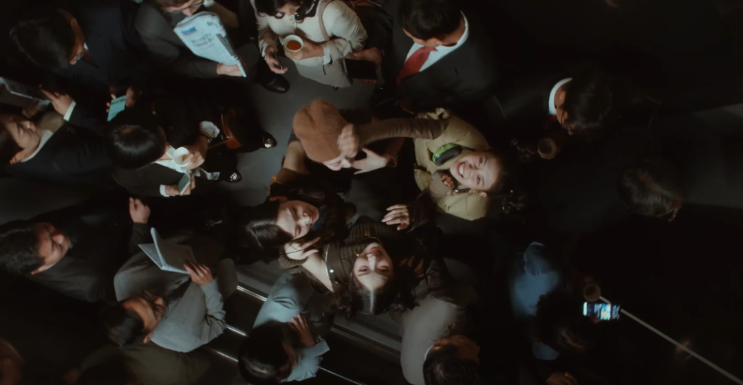 在歌曲MV中,也以更加具像化的形式展现了这一内核。厌烦学校统一的黑长直发型与黑白校服的少女学生,突击检查时藏起的手机、撕掉的指甲油,想要“逃离”古板守旧的校园规则,在地铁、路边偷偷跳舞录制TikTok,却又在看到路人经过时惊慌停止;而在电梯上,少女学生偷偷跳舞玩闹,向着电梯顶比“V”的小确幸,也与同一空间内死气沉沉、面无表情的上班族们形成了鲜明的对比。