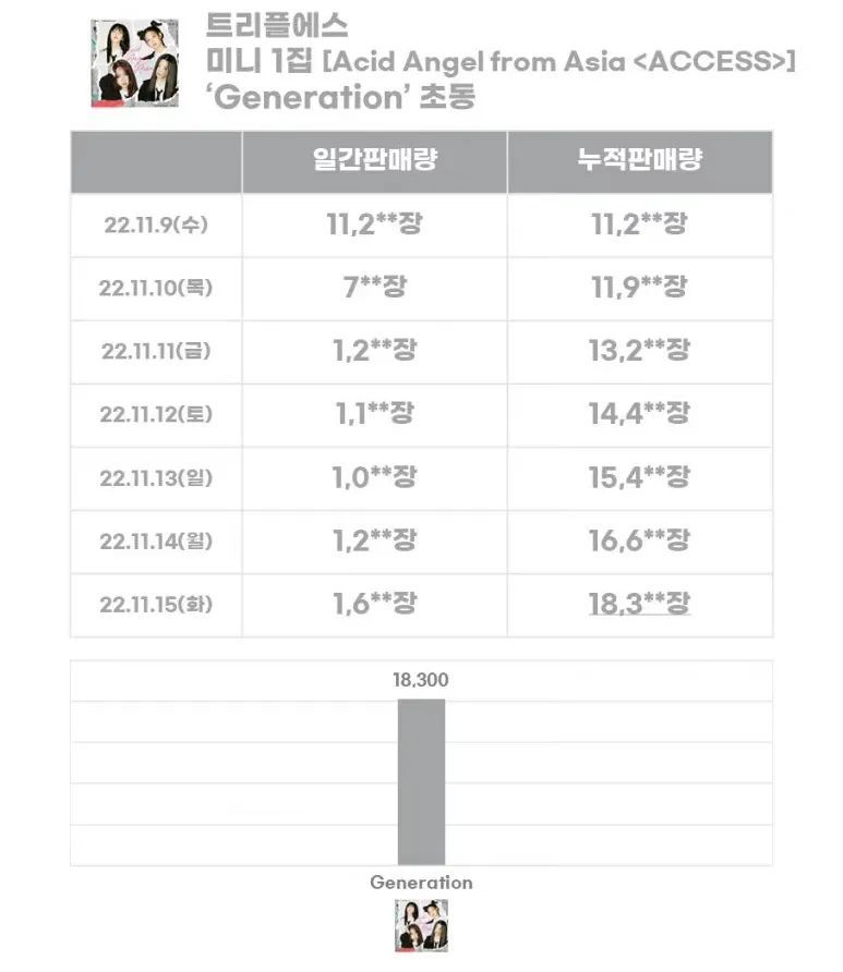 11月20日,制作人郑炳基打造的K-Pop新人女团TripleS小分队AAA为期两周左右的出道活动落下帷幕。其出道曲《Generation》在YouTube的播放量至今已突破2790万,在出道不到半个月的情况下增长了20万左右的订阅用户;这首歌曲也在韩国Melon排行榜持续逆行,从千名开外来到了200环,在YouTube Music、Spotify、Apple Music韩国榜单上也稳居前列。