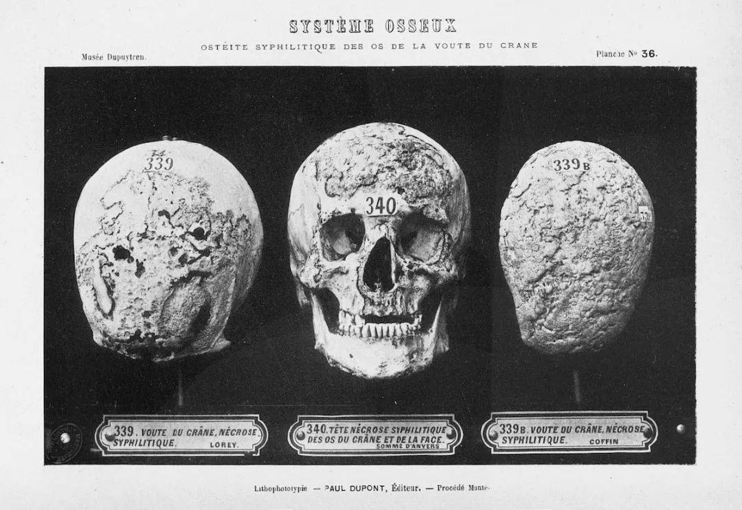 坏死的头骨,很可能来自梅毒患者。照片选自夏尔-尼古拉·韦勒的《杜普伊特伦博物馆藏品目录》图集第二卷。© gallica.bnf.fr