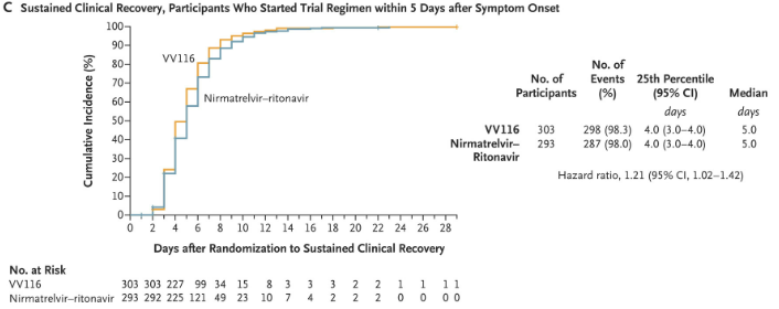 另一些分析也让我更倾向说在症状缓解时间上,二者半斤八两,说VV116更优不合适。那就是符合试验流程,在5天内开始用药的受试者,两组症状缓解所需时间都是中位5天: