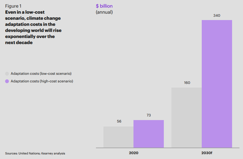图1:未来十年,发展中国家适应气候变化的成本将呈指数级增长(单位:10亿美元),气候适应成本(低成本情景,灰色;高成本情景,紫色),数据来源:联合国;科尔尼分析