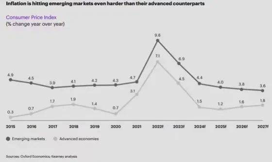 持续的高通胀率导致全球消费价格上涨,其中新兴经济体所受影响更为严重,因为其借贷成本大幅增加。
