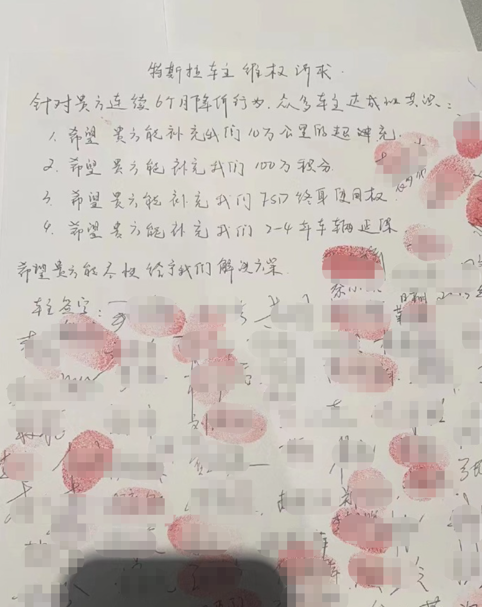 此外,在一份夹杂着签名、红手印的联名信中,部分车主提出特斯拉需要为他们补偿10万公里的超级充电电量、100万车主积分、终身FSD(特斯拉自动驾驶功能,官方售价6.4万元)以及2到4年的整车延长质保。粗略估算下来,上述权益的综合价值会在10万元以上。