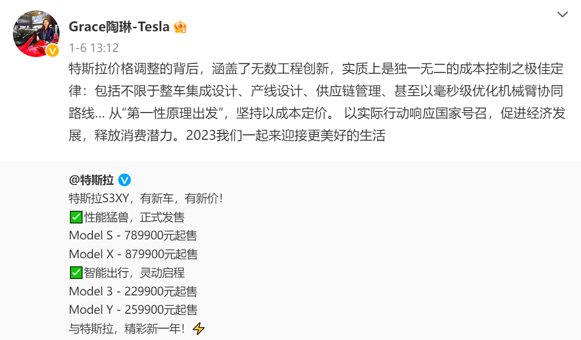 在1月6日宣布降价后,特斯拉对外事务副总裁@Grace陶琳-Tesla在其新浪微博发布了这样一条消息:
