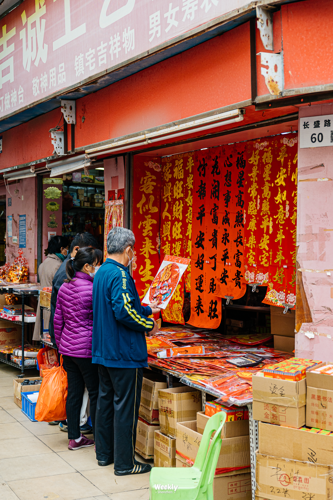 逛到长青路一整排的佛具批发店就能知道,布吉的潮汕人也不少。看门口一排的银元宝好奇和老板搭话。