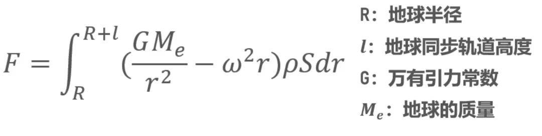 在地心参考系中,将缆绳简化成圆柱状,密度是ρ,横截面是S,一端固定于地球同步卫星,另一端固定于赤道海上基地。考虑在同步卫星轨道附近的一小段缆绳,不考虑各种额外的载重,它受到的拉力可以这样计算: