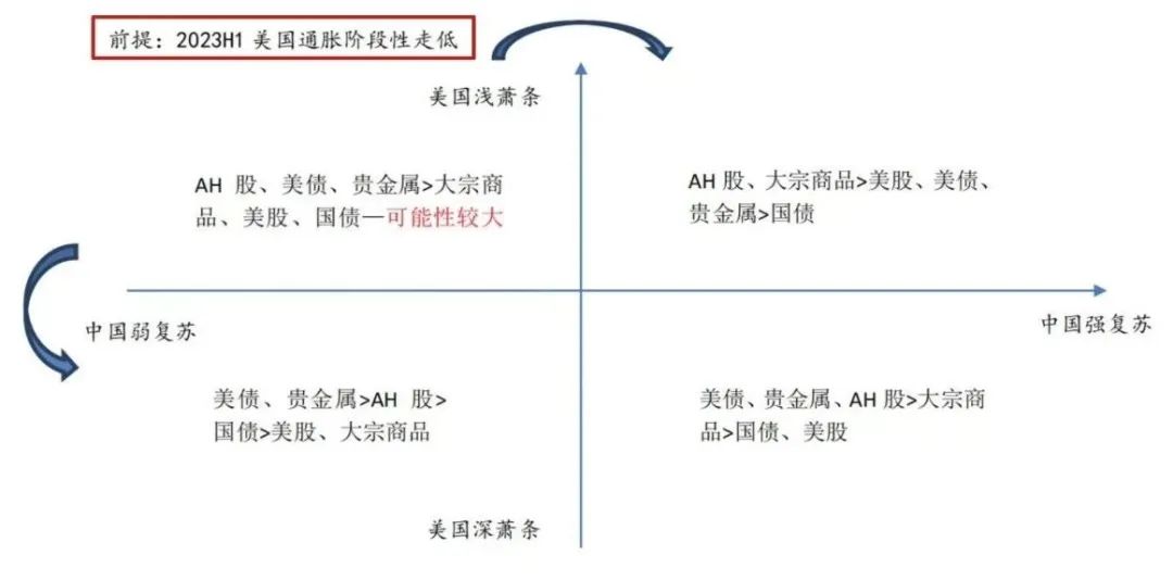 2023年在中国经济走向复苏、美国经济走向衰退的大判断下,我们用四象限来假设各种可能情况。