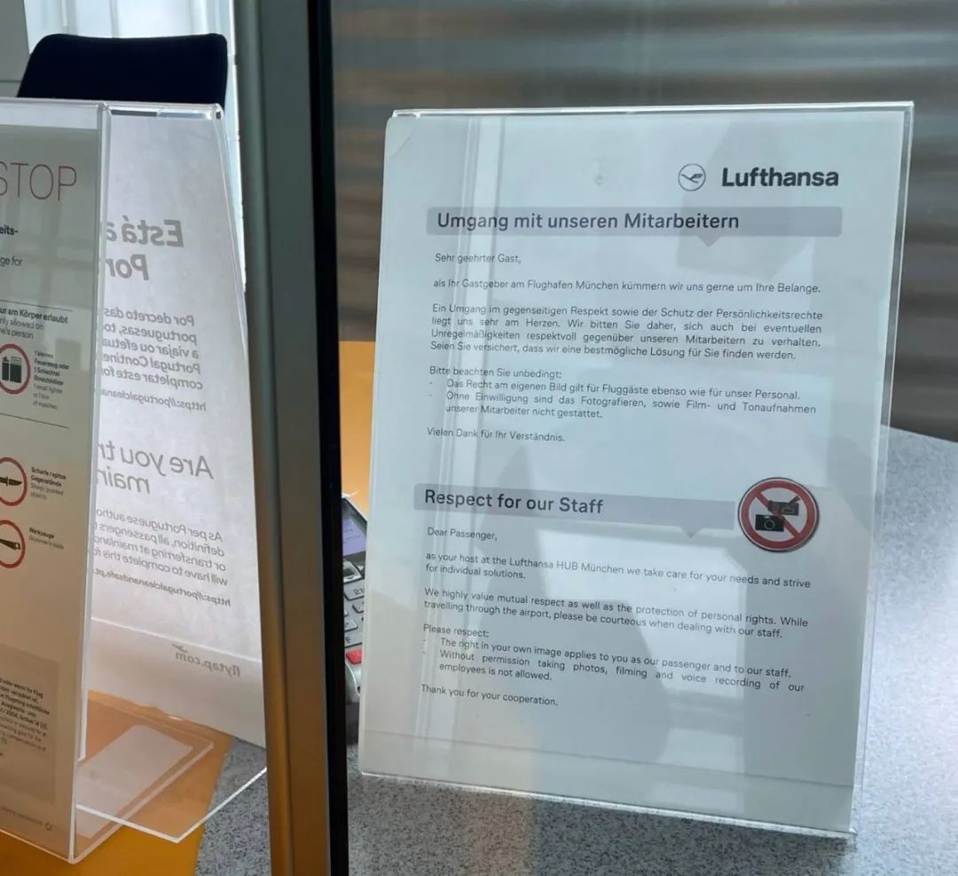 与我们中国民航相对应的,是外国航司对此事的态度,下面这张图是欧洲老牌航司汉莎航空贴在登机口前的一张告示: