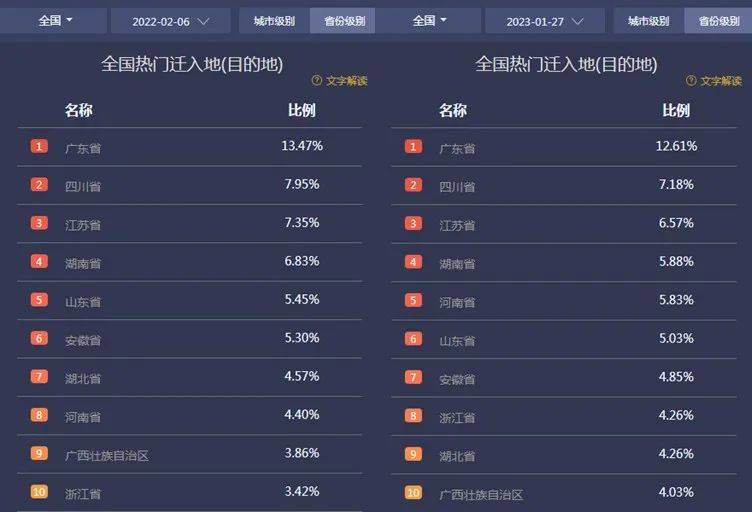 以正月初六也就是节后开工前一天的春运返程小高峰为例,2022年当天全国热门迁入地排名前五的省份分别为广东、四川、江苏、湖南、山东,2023年排名前五的省份则为广东、四川、江苏、湖南、河南。