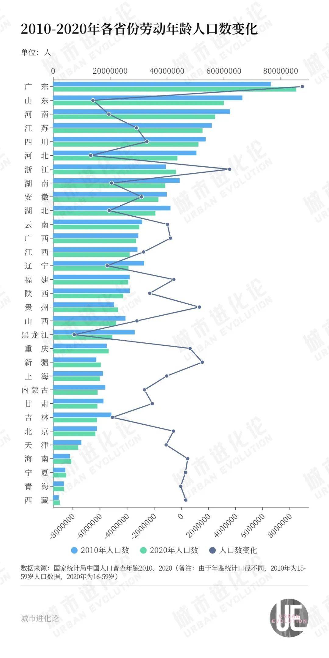 具体到省份,各地劳动人口存量几何?数据显示,2010~2020年,全国有超过20个省份劳动年龄人口总数呈负增长。