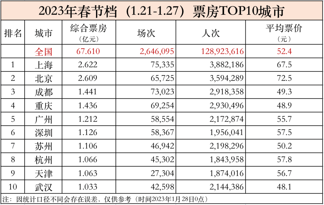 据统计,春节期间上海的综合票房达到2.62亿,位居全国第一,不仅超越疫情前2019年的2.49亿元,也超过2022年最高的2.59亿元。
