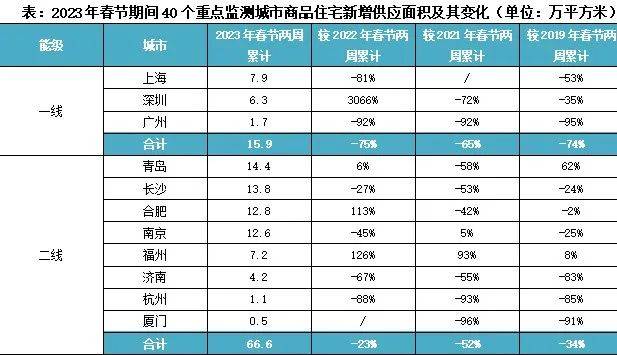 从供应量的角度看,以上海、广州、长沙为代表的一二线城市春节两周的供应,相比疫情前的2019年都在跌。
