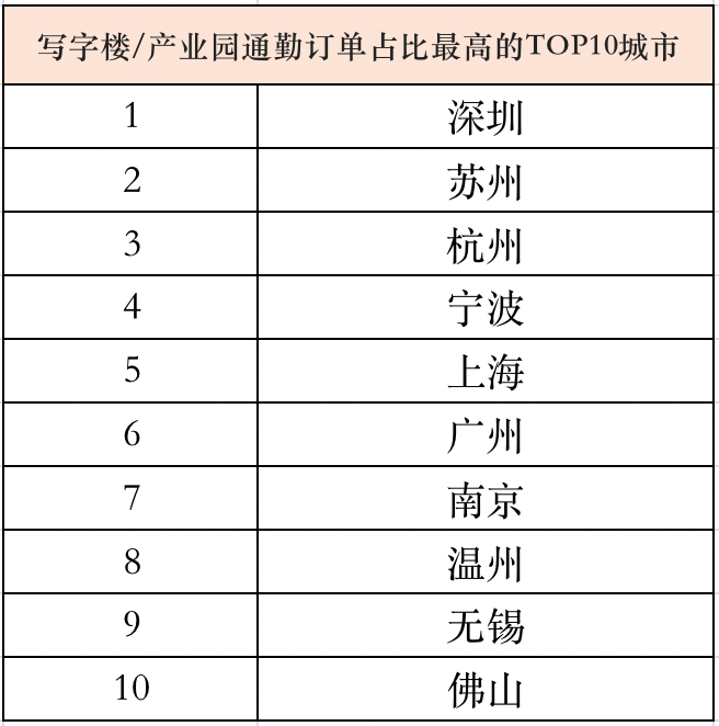 享道全国网约车业务中,写字楼/产业园通勤订单占比最高的城市暨“享道最勤劳城市”TOP 1 城市为深圳。