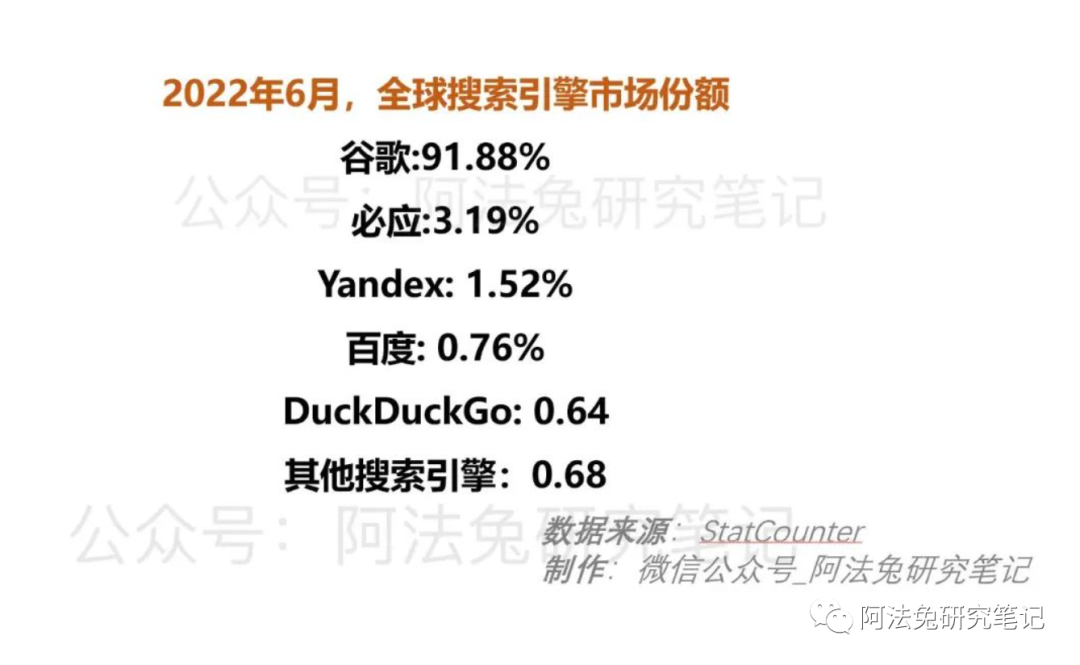 谷歌搜索所占的市场份额同样令人印象深刻。谷歌占据了84%到91%的市场份额,其他搜索引擎只有个位数,当然,根据数据统计的不同,这一份额在过去几年可能略有下降,但幅度总体不大。谷歌在围绕搜索业务建立其他生态优势方面做得非常好。比如说,每当用户下载Chrome浏览器或购买安卓手机时,谷歌基本上强制了用户使用自家搜索引擎。