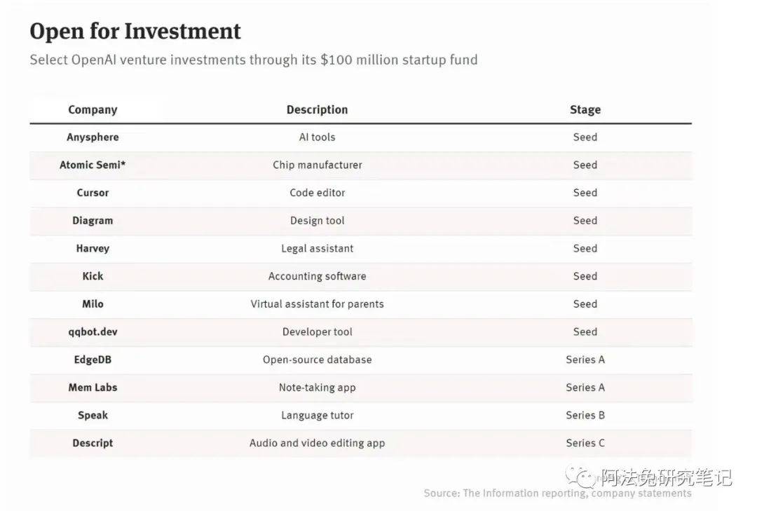 (笔者注:以下是OpenAI参与投资的公司,这样,这些企业都可以在早期应用OpenAI的模型)