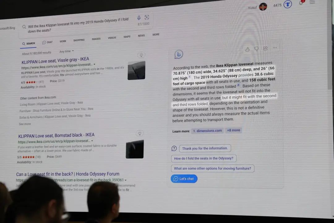 搜索宜家的双人座椅是否适合小型货车时,“新必应”可以找到双人座椅和汽车的尺寸,并回答是否合适,为你做出判断。