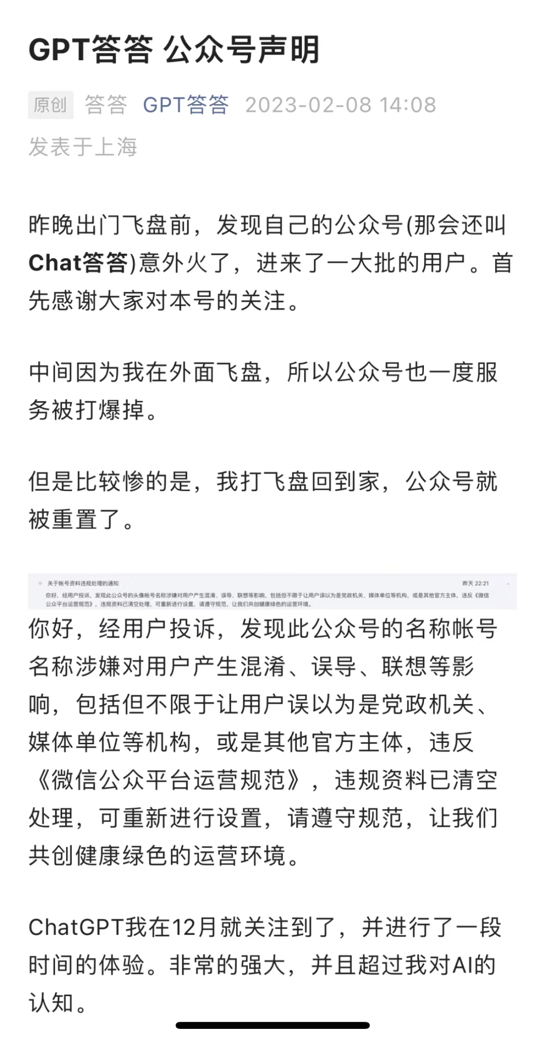 《每日经济新闻》记者注意到,近日,有相关公众号发声明称因账号名称涉嫌误导,已被微信官方重置。