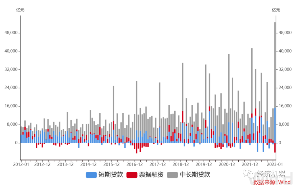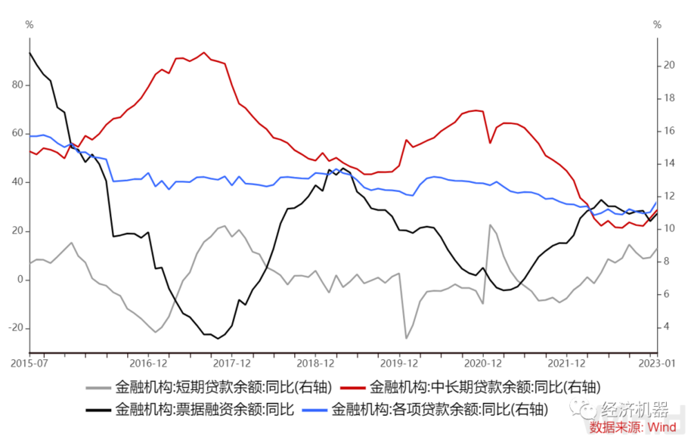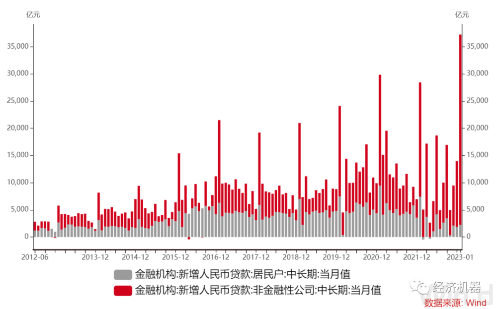 企业中长期贷款增长显著,得益于疫情放开、政策支持,企业信心有所恢复。1月非金融机构中长期贷款新增35000亿,远高于近5年同期均值21400亿。从地方两会透露的信息来看,今年地方投资不仅发力早,力度也大,多地在政府工作报告中提出2023年固定资产投资增速预期目标,最低为6.5%左右,最高为15%左右。再加上疫情放开后,存在一些积压性信贷需求积极释放,共同促进了企业中长期贷款放量增加。