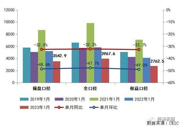 整体来看,1月份,TOP100房企仅实现销售操盘金额3542.9亿元,单月业绩规模同比降低32.5%,环比降低48.6%,较2022年2月的降幅也达11.8%(图3)