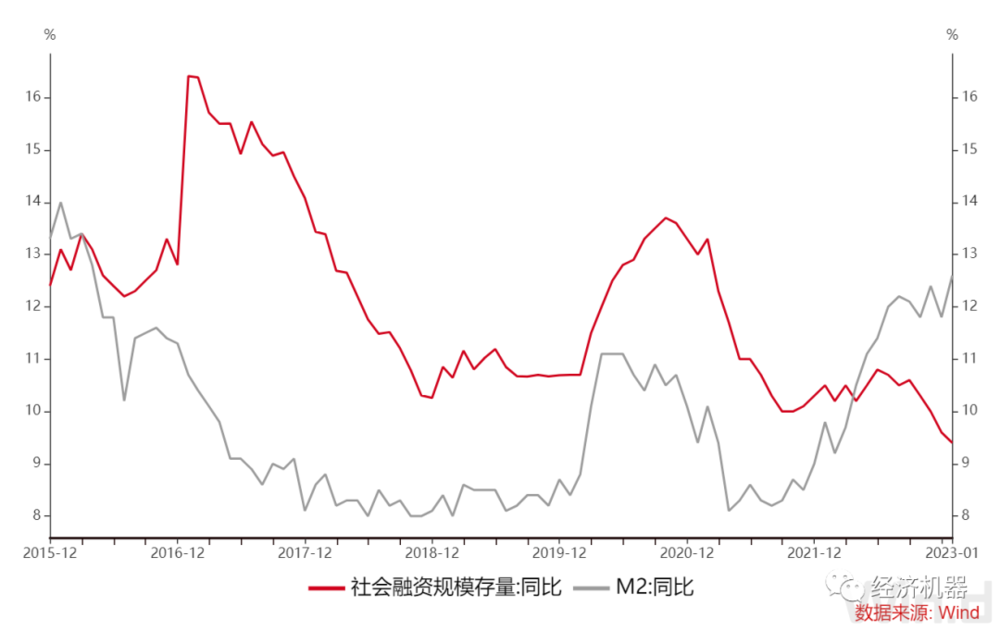 图8. 社融存量同比与M2同比