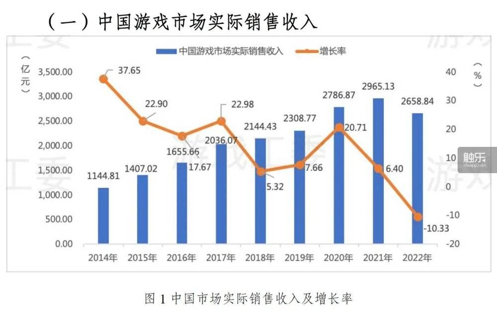 报告显示,2022年中国游戏市场实际销售收入2658.84亿元(未注明均为人民币,下同),同比下降10.33%;中国游戏用户规模为6.64亿人,同比下降0.33%。继2021年规模增长明显放缓之后,2022年游戏行业关键数据8年来首次出现下降。这表明产业发展已进入存量市场时代。