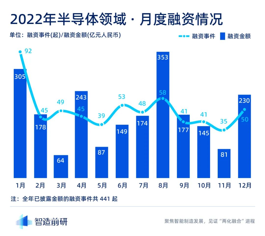 当时间来到年中,随着芯片市场需求的减少和产能的过剩,资本投资的重点开始转向半导体设计研发领域,此时 10 亿元以上的大额融资开始增多,多数流向芯片研发和其他组件研发领域。8 月份是半导体行业 IPO 上市的集中时段,也将本月的月度融资额推上了全年最高峰,年末的融资金额虽有所下滑但却在 12 月份出现反弹,可能与海外国家进一步提高制裁范围有关。