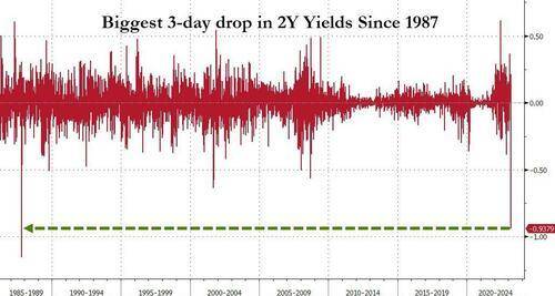 周一盘中,两年期美债收益率在三个交易日里累跌超100个基点,为1987年10月美股“黑色星期一”股灾以来的最大三日跌幅,并超过2001年9月11日之后三天的累跌63个基点。上周该收益率曾升至5.084%,创下2007年6月以来的近十六年最高。