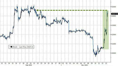 主流加密数字货币不少两位数百分比跳涨,整体市值涨超700亿美元并重上1万亿美元。市值最大的龙头比特币尾盘涨超15%,日内接连升破2.2万至2.4万美元三道整数位,至2月21日以来的三周高位。第二大的以太坊涨9%并升破1680美元,至2月20日以来最高。全球第二大稳定币USDC接近恢复与1美元价格挂钩,发行商Circle称在硅谷银行33亿美元存款得以返还。