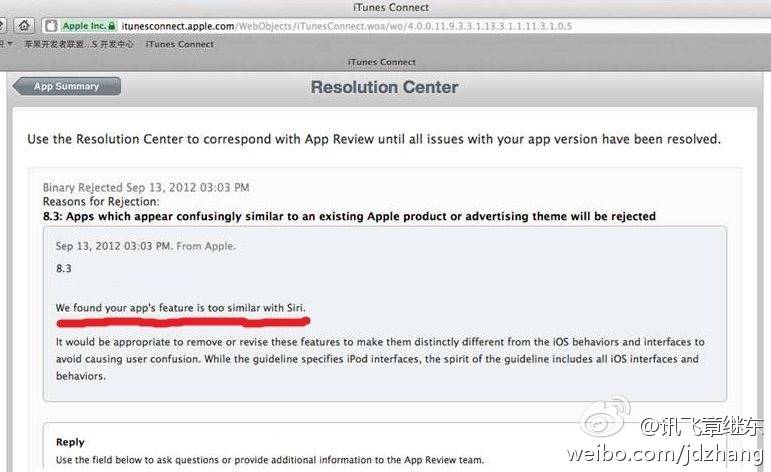 “第一次被退回是在今年7月,6月底讯飞语点第一次提交苹果App Store上线审核,但随后苹果App Store拒绝了讯飞语点的申请,并要求科大讯飞提供讯飞语点的具体应用演示video。在做了产品演示Video并再次提交后,亦被第二次打回,这次的理由是‘有些功能模仿Siri’。而第三次,苹果则更加露骨的表示‘你们的产品太像Siri了’阉掉吧,没办法看到搜狗上去了(App store),我们不能输在用户印象和品牌上,所以开始尝试逐步阉割,这次算是阉割到位了,才能上线。”