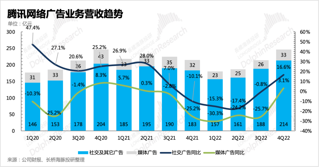 实际腾讯广告收入同比增长近15%,除了对视频号、小程序带来的增量有部分预期之外,媒体广告比较让人意外的,在低基数下从上季度-25%的泥潭,直接转为正增长了,不再拖累整体广告收入。