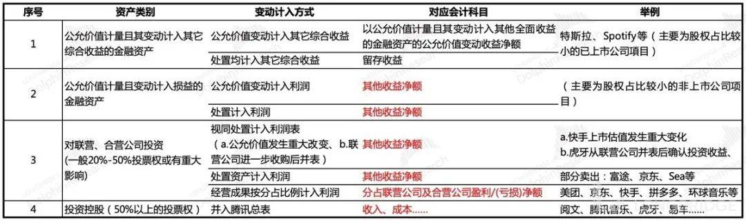 腾讯对于自己旗下规模庞大的投资性资产,一直采取偏谨慎保守的会计处理方法。对于持股比例较大的上市公司投资,腾讯主要归为联营公司资产,仅确认按持股比例计算的被投公司利润(计入分占联营公司收益),但股价波动带来的损益,并未计入到当季的利润中,只有处置或视同处置才会计入。年初的京东、Sea,现在的美团都被确认了处置损益。