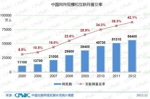 1、网民数量:截至2012年12月底,我国网民规模达5.64亿,全年共计新增网民5090万人。互联网普及率为42.1%,较2011年底提升3.8个百分点,普及率的增幅降低。