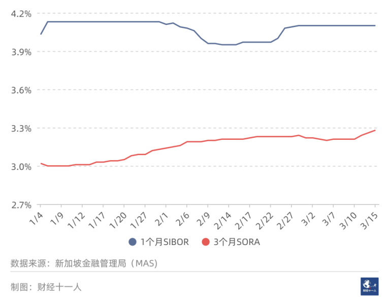 SORA为新加坡平均隔夜利率。星展银行的浮动利率计算公式是,3个月的SORA数值+1%。2023年3月23日3个月的SORA数值为3.44%,所以计算得出的浮动房贷利率为4.44%。